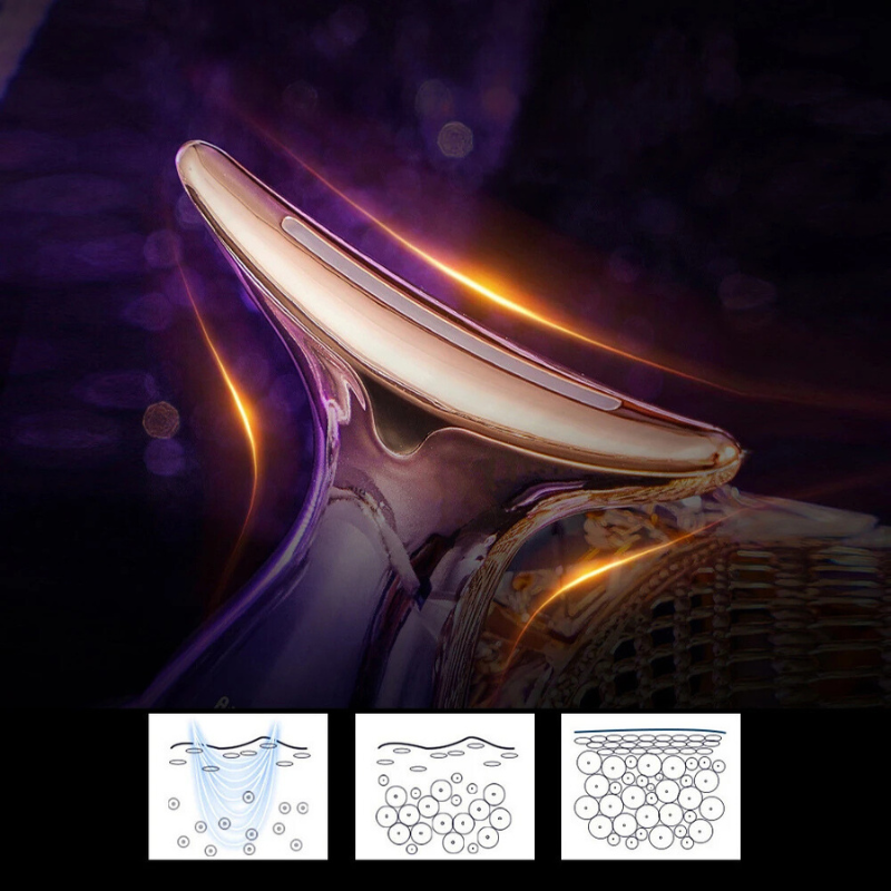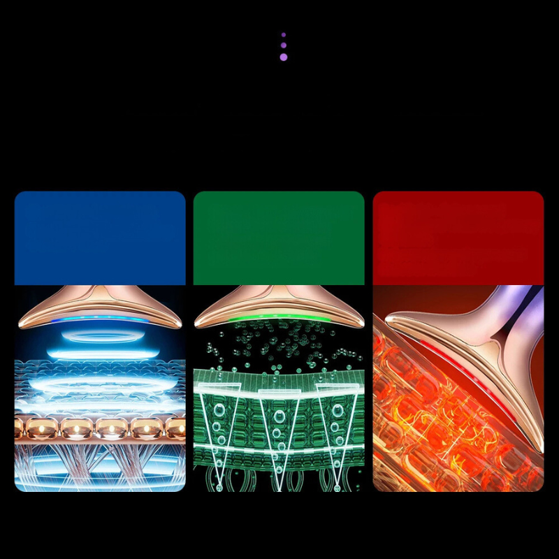 - Driekleurige fototherapie: Blauw licht kalmeert de huid, groen licht verbetert de elasticiteit en rood licht stimuleert de collageenproductie om de jeugdigheid van de huid te herstellen.